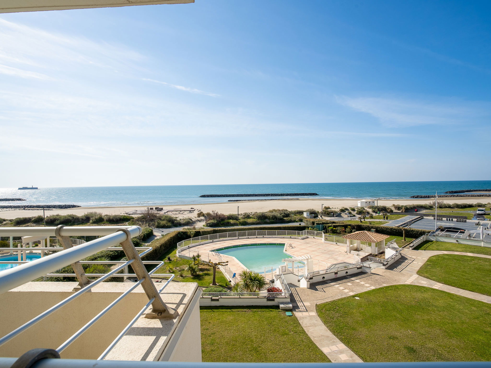 Résidence "Le Sunset/Cap Sud". Dans le quartier de Rochelongue, à 100 m de la mer, à 100 m de la plage. En commun: jardin (clôturé), piscine (12 x 6 m, profondeur 40 - 175 cm, disponibilité saisonnière: 01.Mai. - 30.Sep.). Espace de jeux pour les enfants. Infrastructures de la résidence: ascenseur. Parking public 50 m possible dans la rue. Magasins, magasin d'alimentation, restaurant 350 m, boulangerie 110 m, arrêt de bus "Mail de Rochelongue" 280 m, plage de sable "Rochelongue" 230 m. Port plaisance 3 km, terrain de golf (27 trous) 1.5 km, tennis 3 km, centre équestre 1.4 km. Attractions à proximité: Aqualand 1.7 km, Ile des Loisirs 1.9 km, Musée de l'Ephèbe 3 km, Casino 2.5 km, Luna Park 2.4 km, Accrobranche 4.7 km.