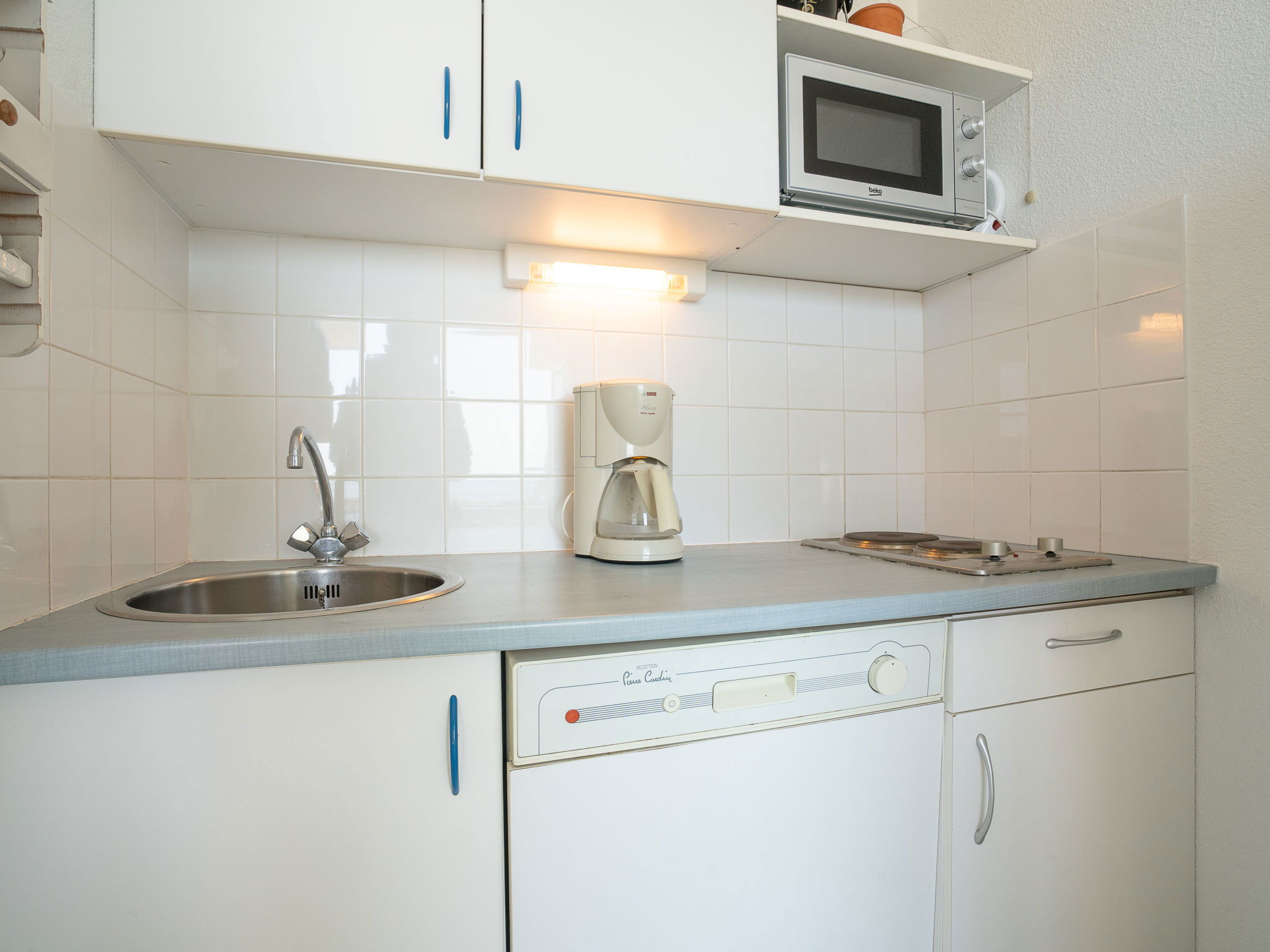 Appartement de 2 pièces 30 m2 au 4ème étage. Logement idéal pour 2 adultes + 2 enfants. Clair, partiellement rénové en 2019, aménagement fonctionnel et confortable: séjour avec 1 divan-lit double (140 cm, longueur 190 cm), TV (écran plat). Sortie sur la terrasse, orientée sud. 1 chambre avec 1 grand-lit (140 cm, longueur 190 cm). Coin cuisine (lave-vaisselle, 2 plaques à induction, micro-ondes, congélateur, cafetière électrique). Salle de bains, douche, WC séparé. Chauffage, chauffage électrique. Terrasse 8 m2, situation est et situation sud. Mobilier de balcon, barbecue électrique. Très belle vue panoramique sur la mer et la piscine. A disposition: Internet (Connexion WIFI, en sus). Garage No 111, hauteur 185 cm, largeur 250 cm. Veuillez noter: adapté(e) aux familles. Détecteur de fumée.