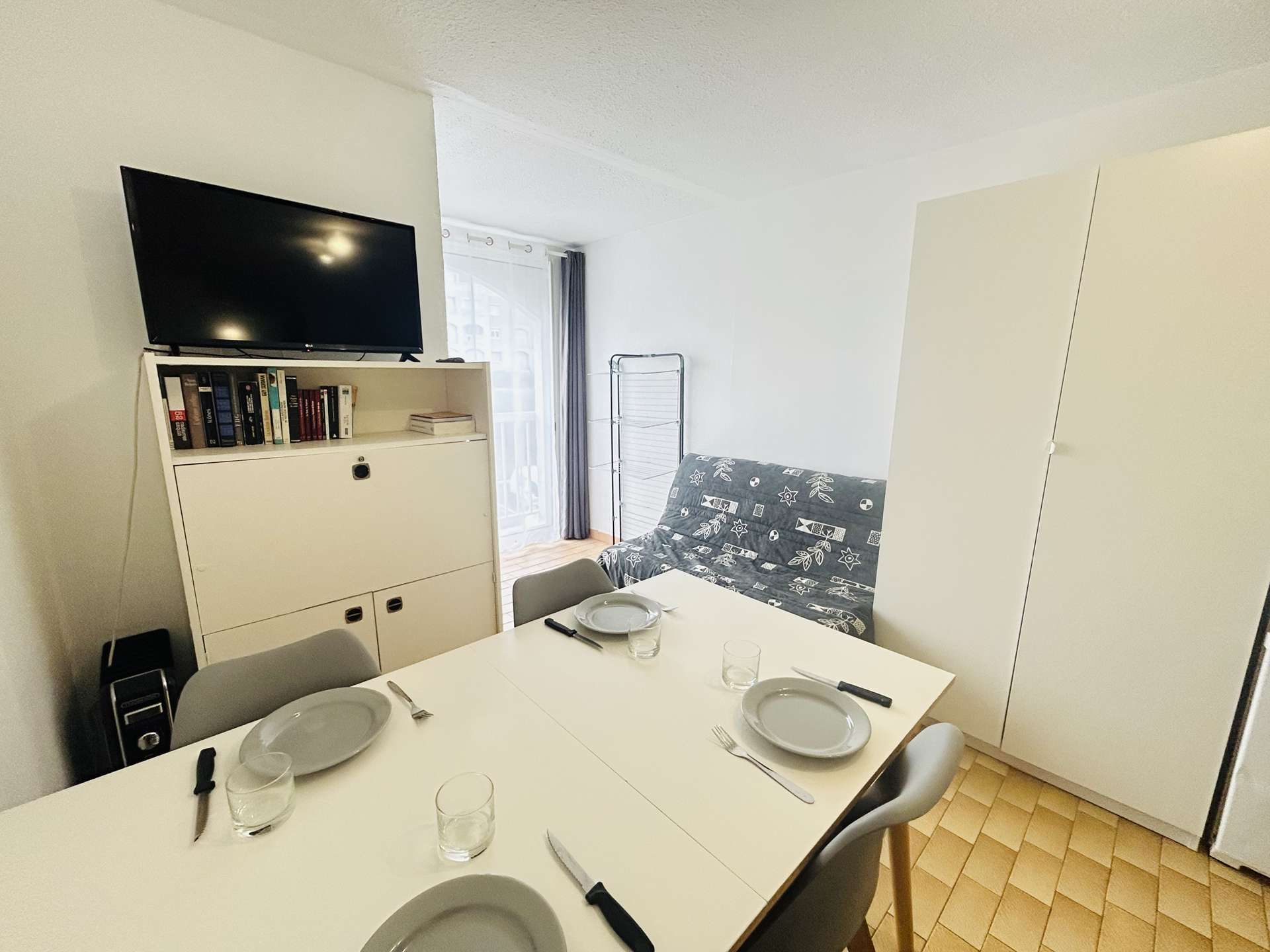 Cette location d'appartement située au 2ème étage sans ascenseur, comprend un séjour avec 2 canapés convertibles de type BZ deux places, une cuisine équipée d'une machine à laver, sèche-linge et lave vaiselle, une salle de douche, avec WC.