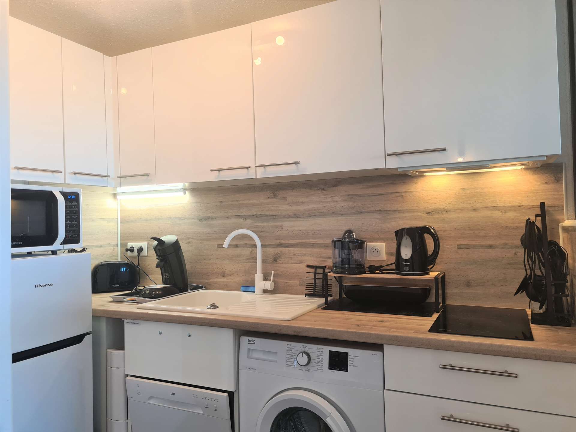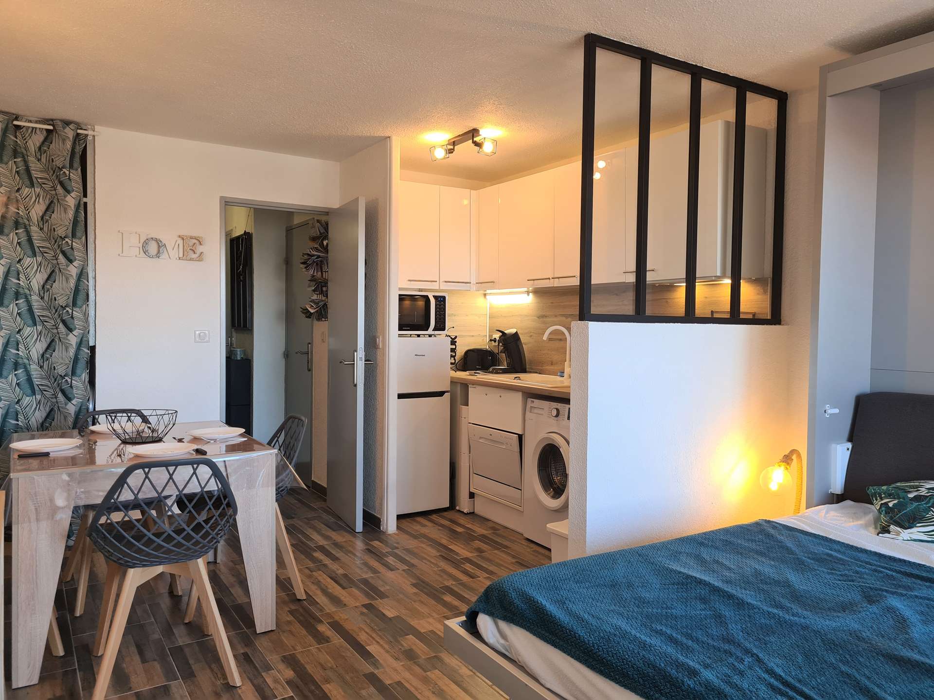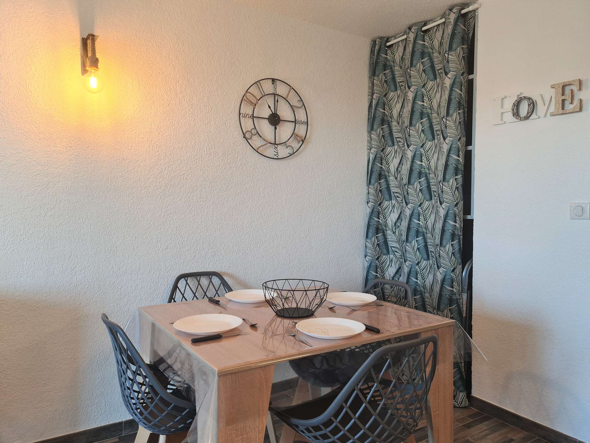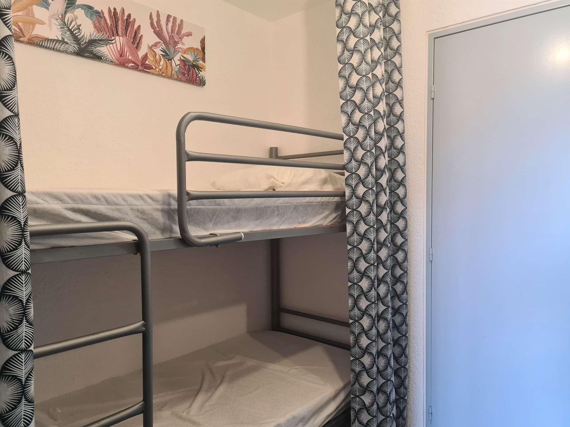 Cet appartement de vacances situé au 3ème étage sans ascenseur comprend un séjour avec une télévision, un coin cabine avec 2 lits superposés en 90 chacun, une cuisine équipée, une salle de douche et un WC séparé. Animaux non admis.