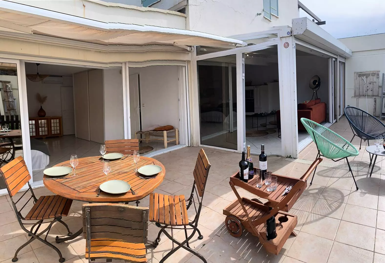 Très beau séjour lumineux donnant sur la grande terrasse exposée sud ouest meublé d'un canapé lit, et d'un téléviseur écran plat