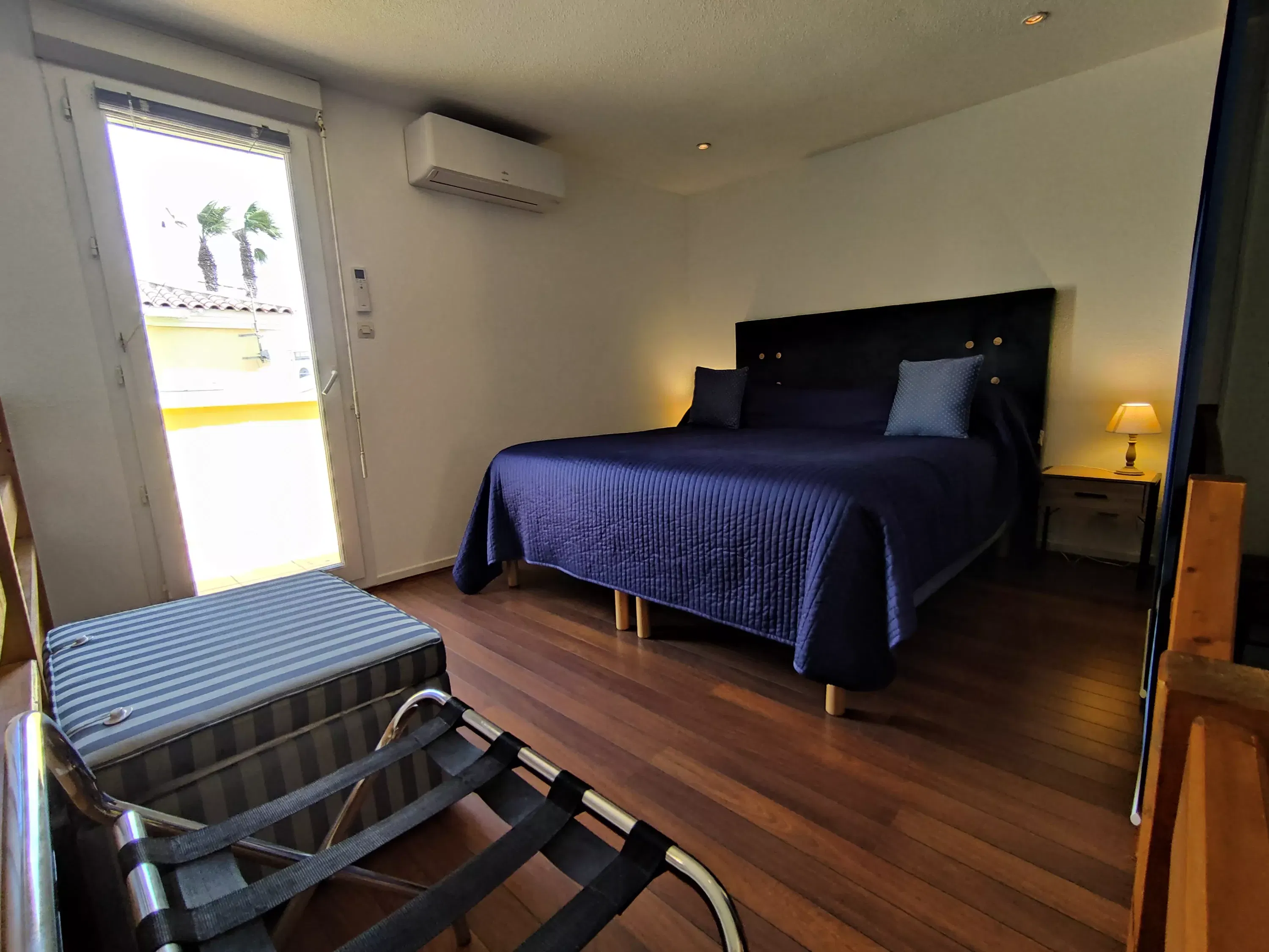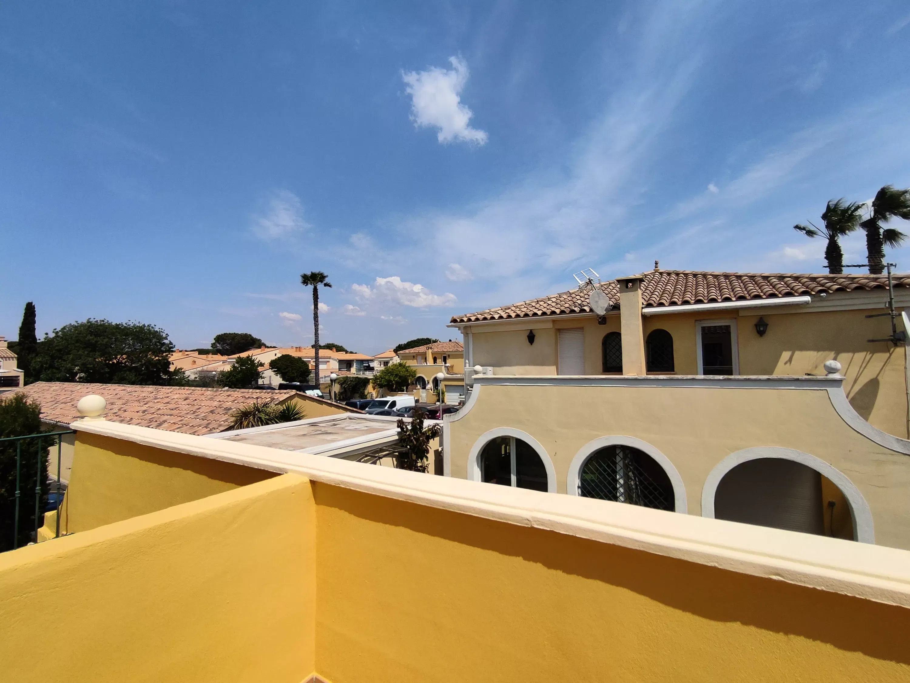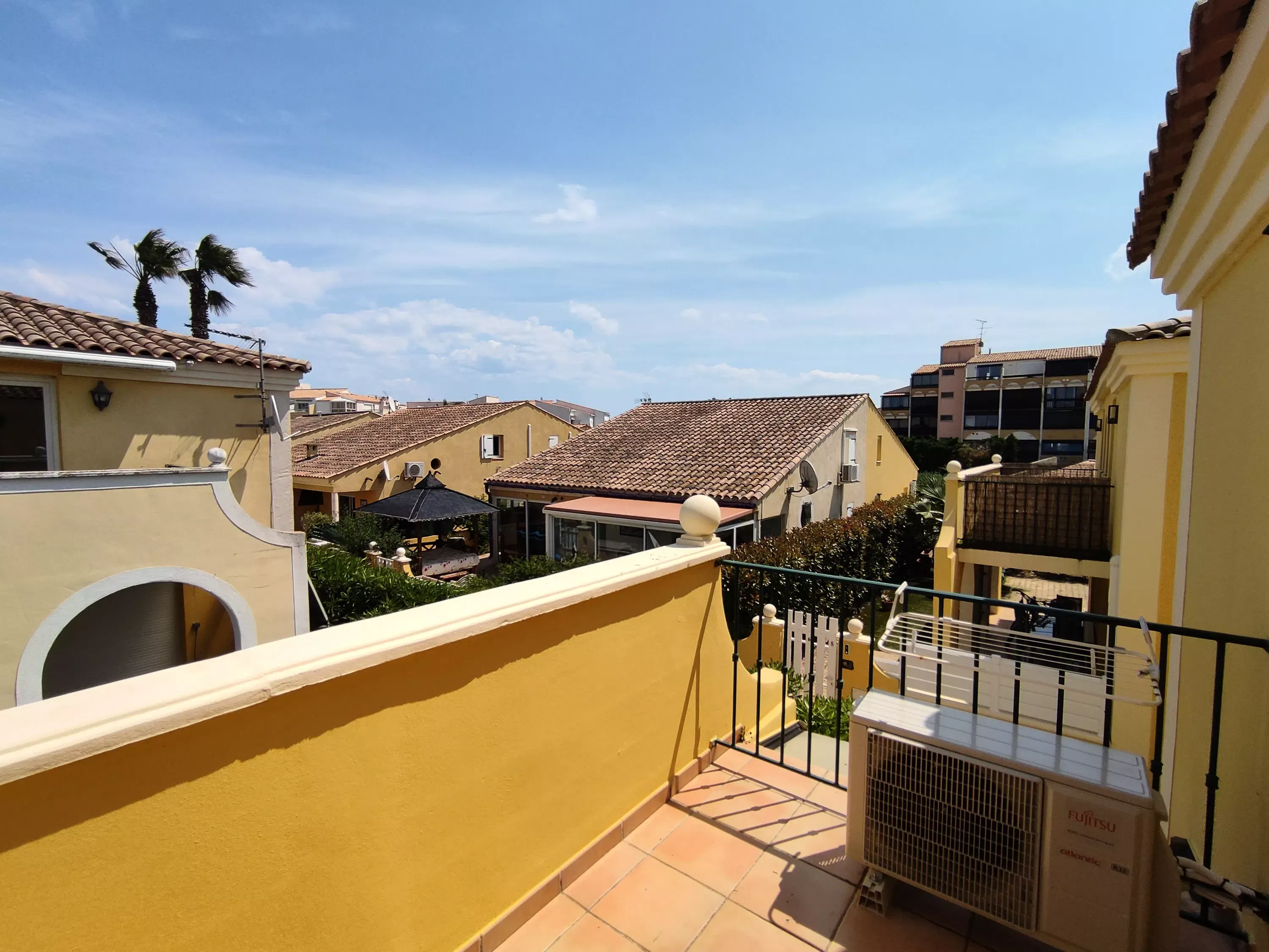Villa climatisée pour 2/4 personnes, située Résidence Le Jardin de la Palmeraie. En rdc : séjour, coin cuisine équipée (lave-vaisselle, lave-linge, micro-ondes...), salle d'eau avec wc , terrasse. A l'étage : coin nuit avec lit pour 2 personnes en 180 cm et canapé, salle d'eau avec wc. 2ème petite terrasse. Garage N°1. Accès privilège à la piscine de l'hôtel Eve situé à proximité (en fonction des disponibilités).