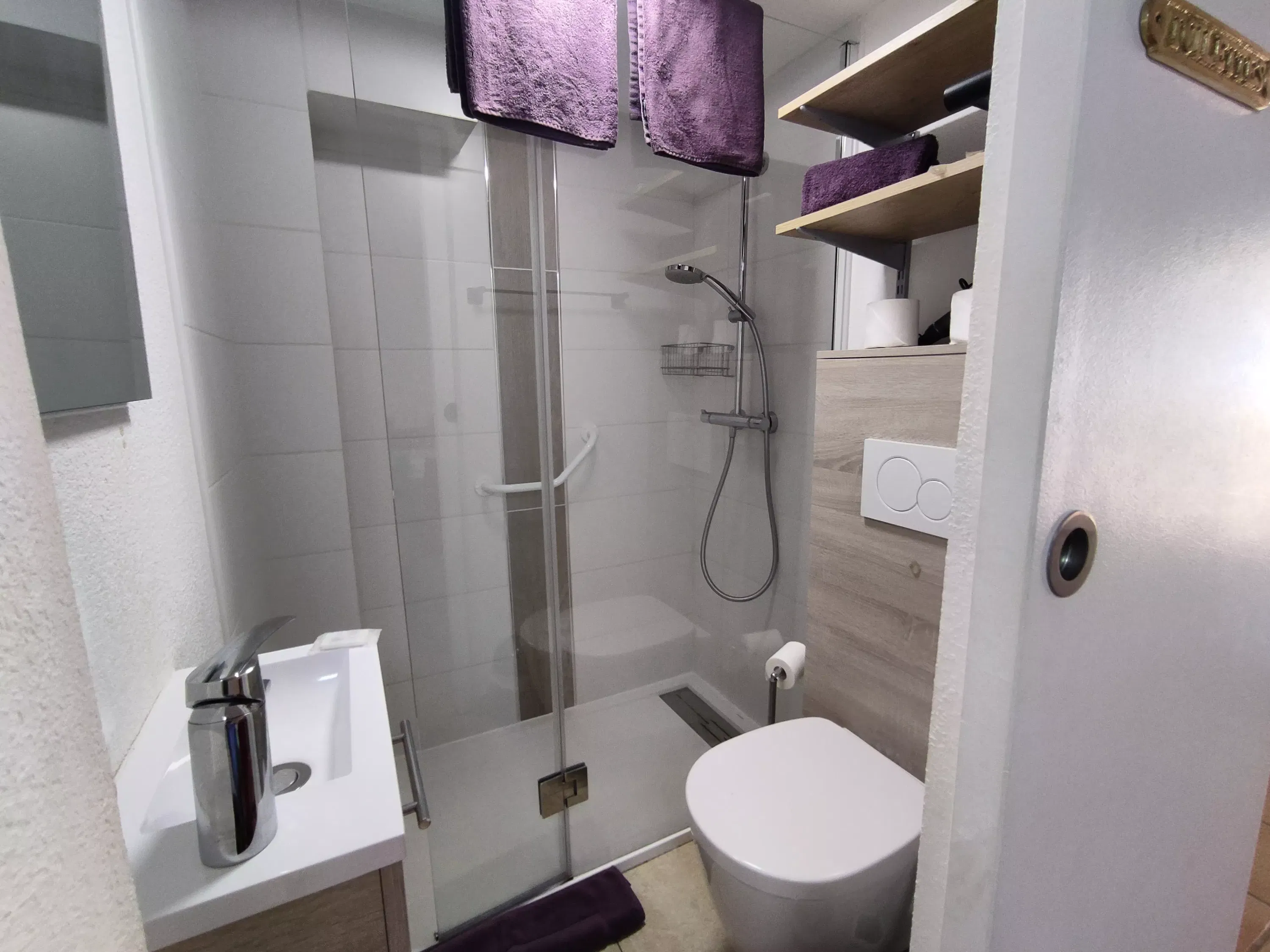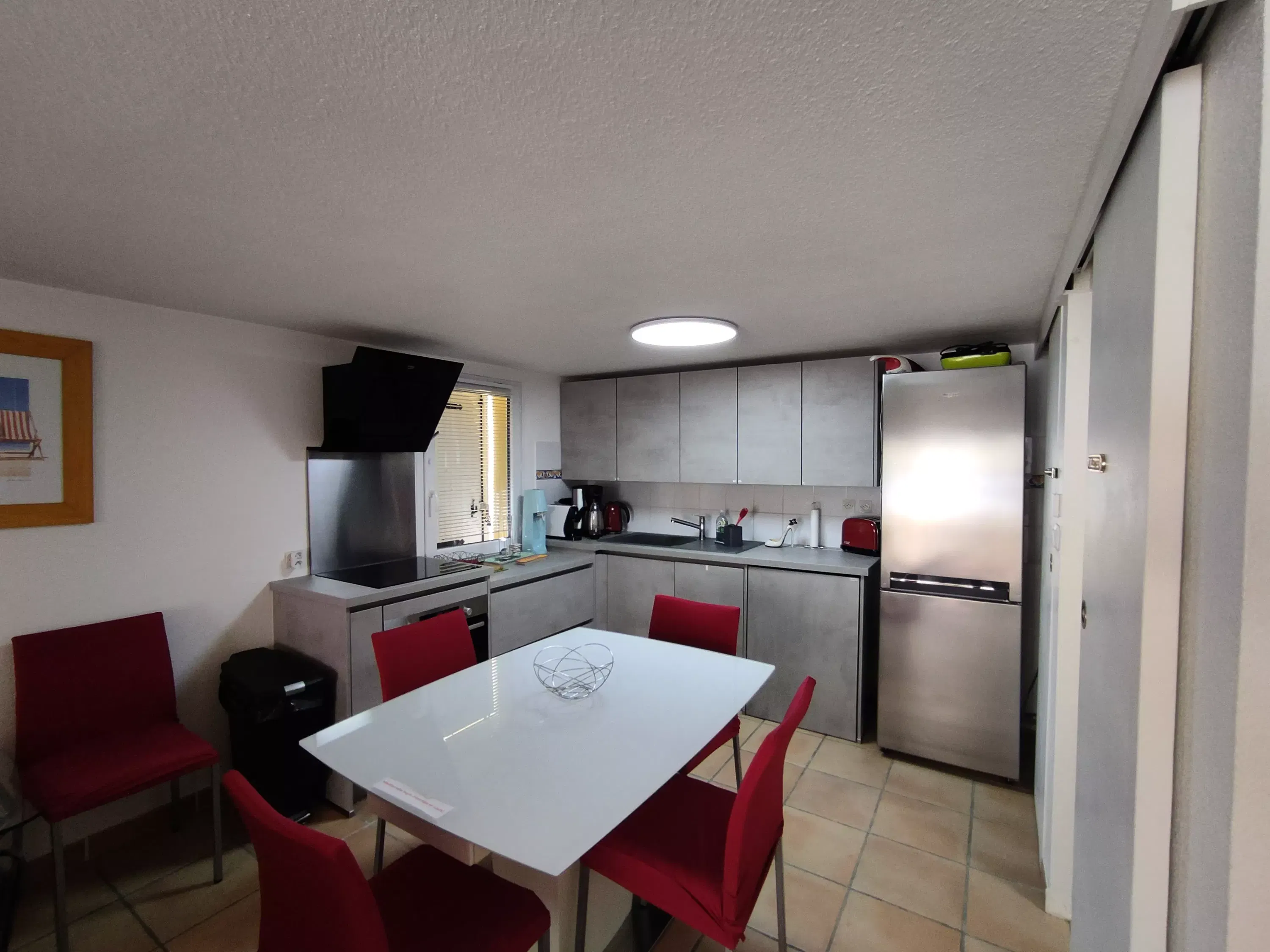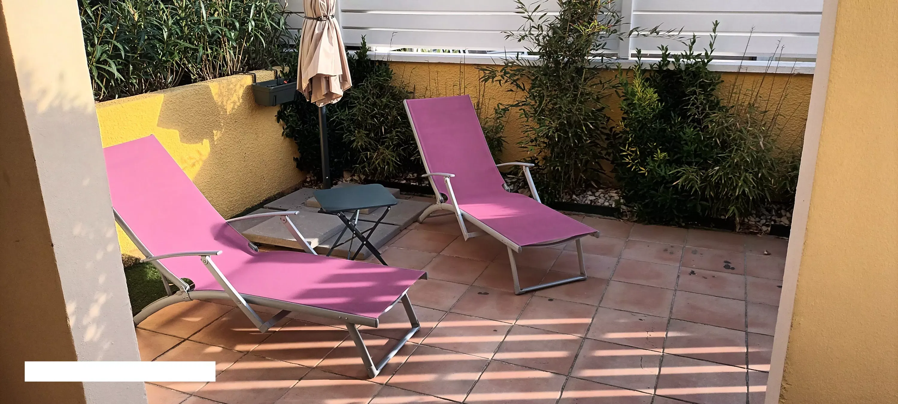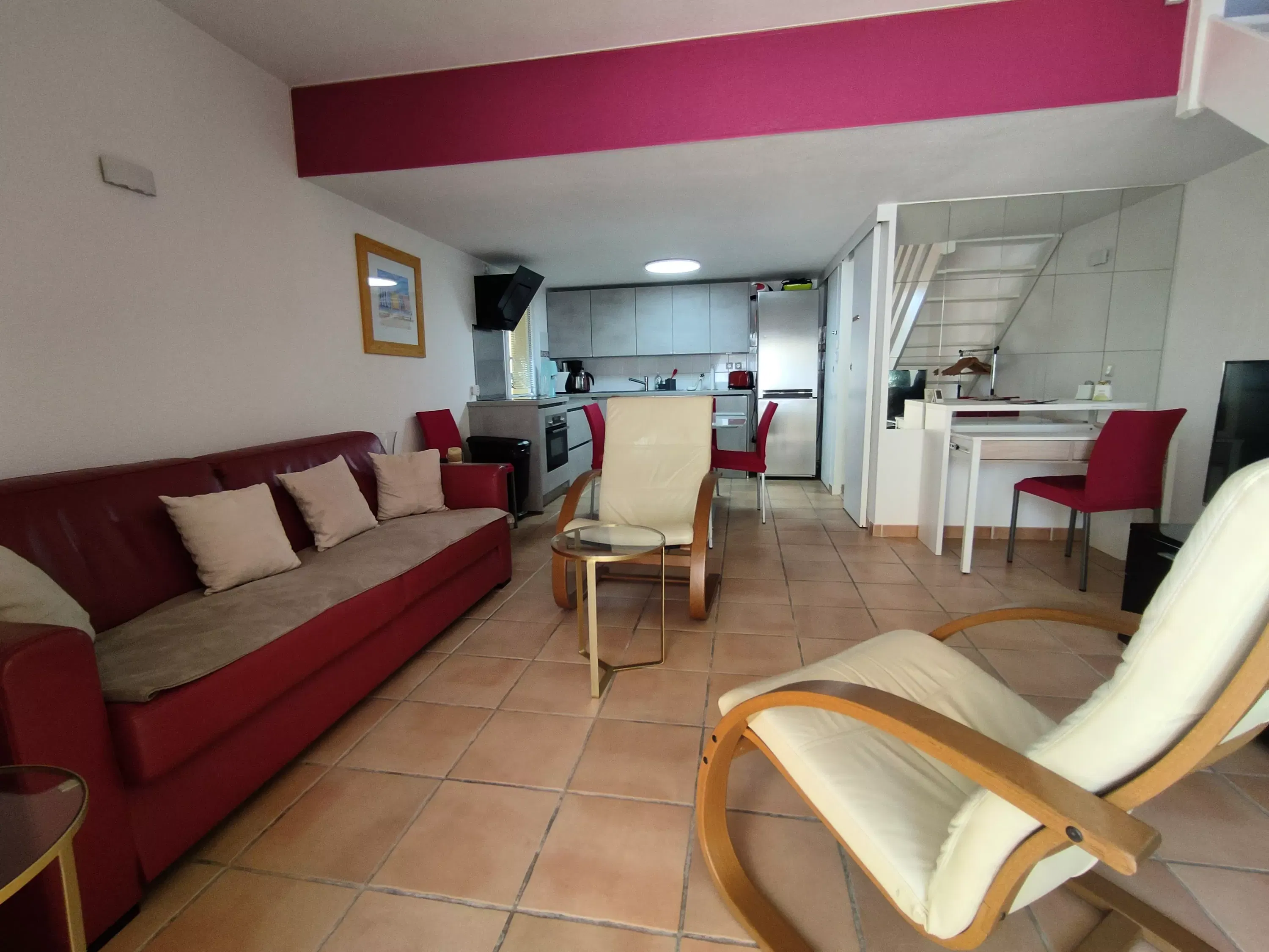 Villa climatisée pour 2/4 personnes, située Résidence Le Jardin de la Palmeraie. En rdc : séjour, coin cuisine équipée (lave-vaisselle, lave-linge, micro-ondes...), salle d'eau avec wc , terrasse. A l'étage : coin nuit avec lit pour 2 personnes en 180 cm et canapé, salle d'eau avec wc. 2ème petite terrasse. Garage N°1. Accès privilège à la piscine de l'hôtel Eve situé à proximité (en fonction des disponibilités).