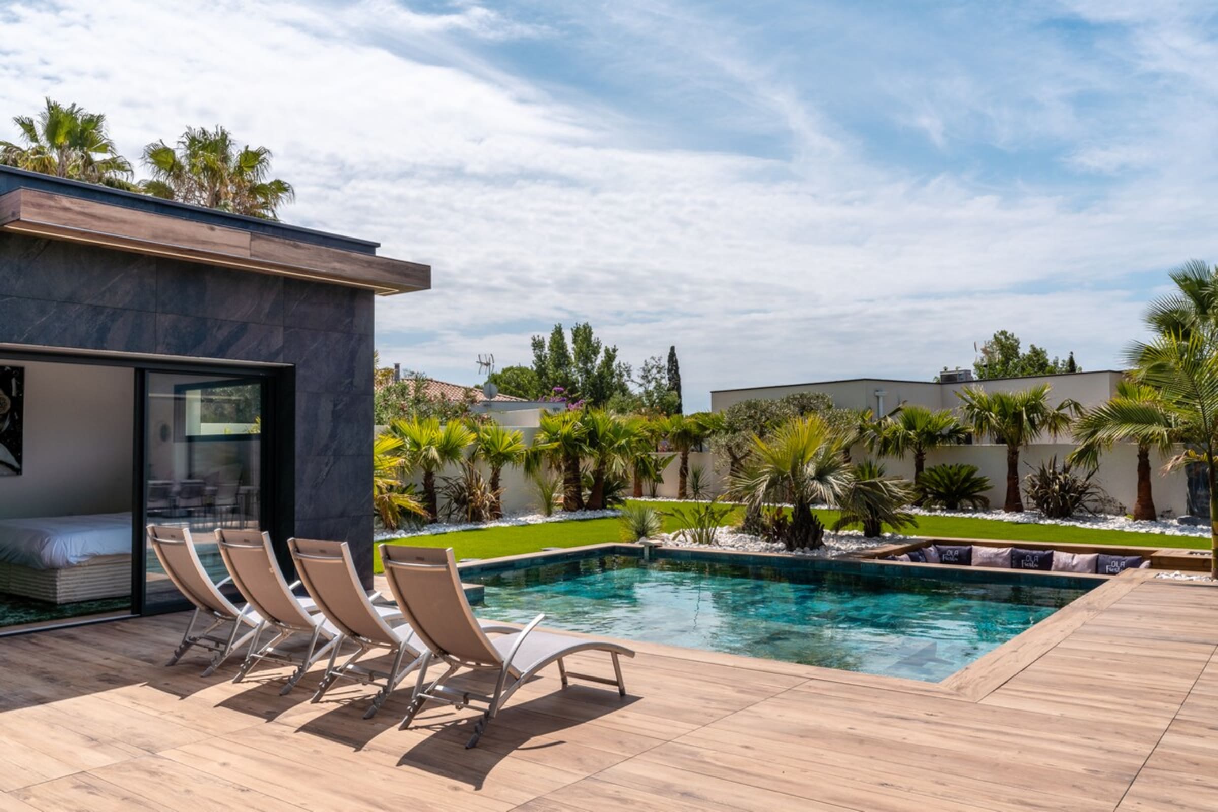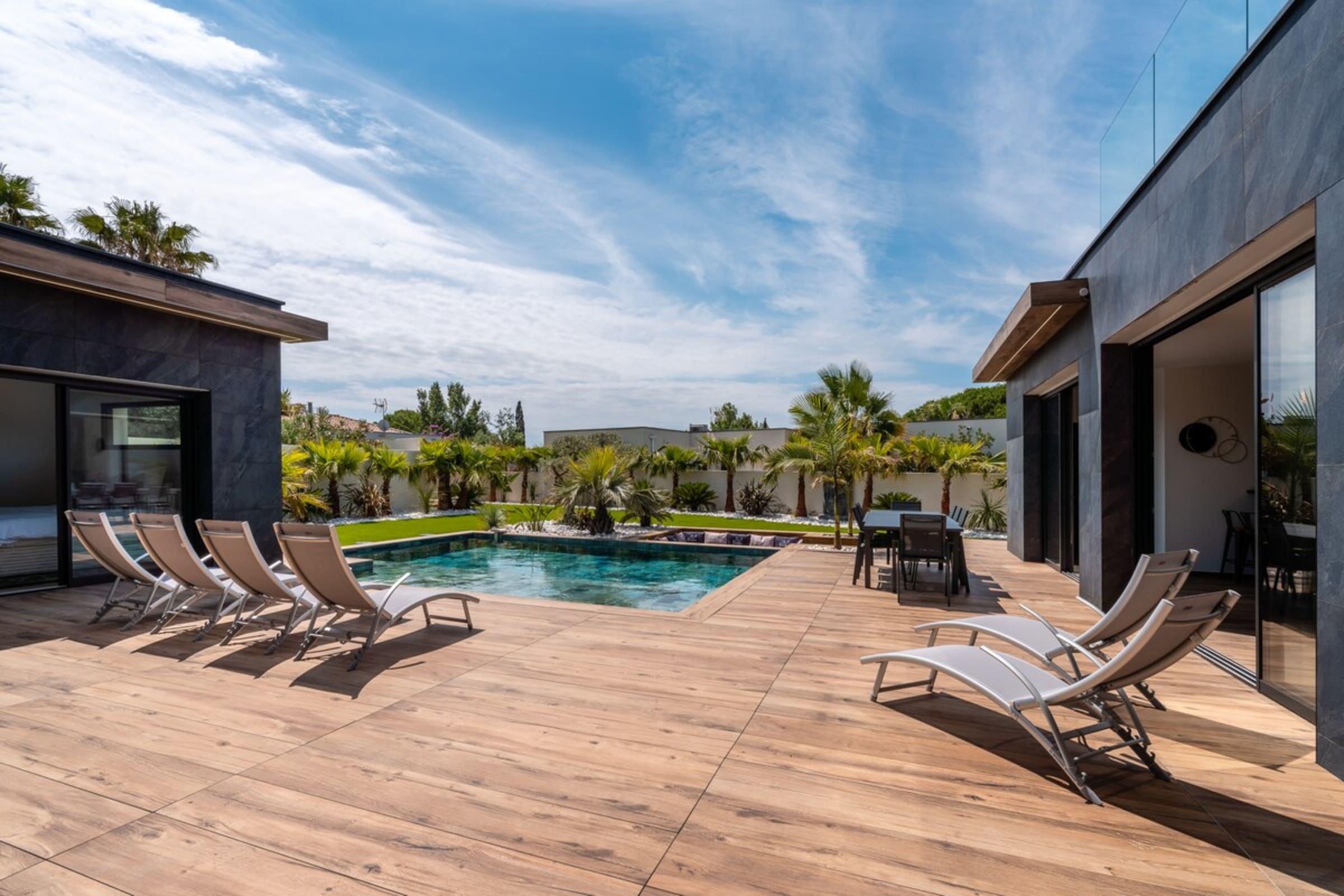 Au Grau d’Agde, la Villa Signature déploie de grands volumes dans une résidence de villas privée et sécurisée. En cinq minutes à pied, vous êtes sur la plage. De retour, on retrouve la quiétude d’un domaine confidentiel, le souffle des palmiers et une architecture pensée autant pour les familles que pour les escapades entre amis.