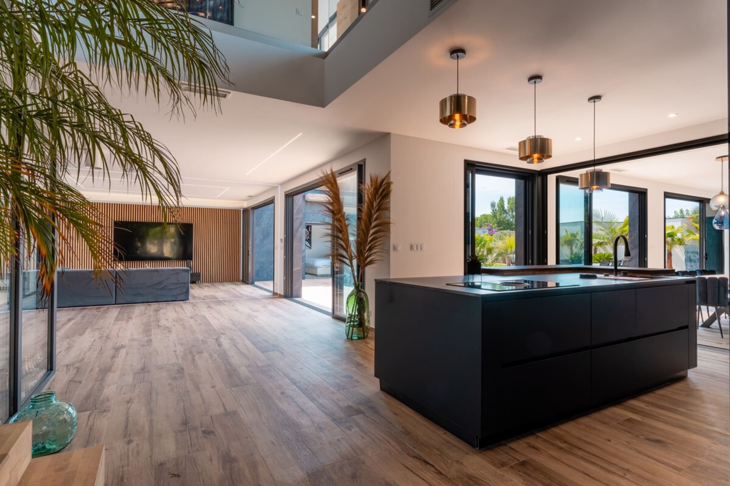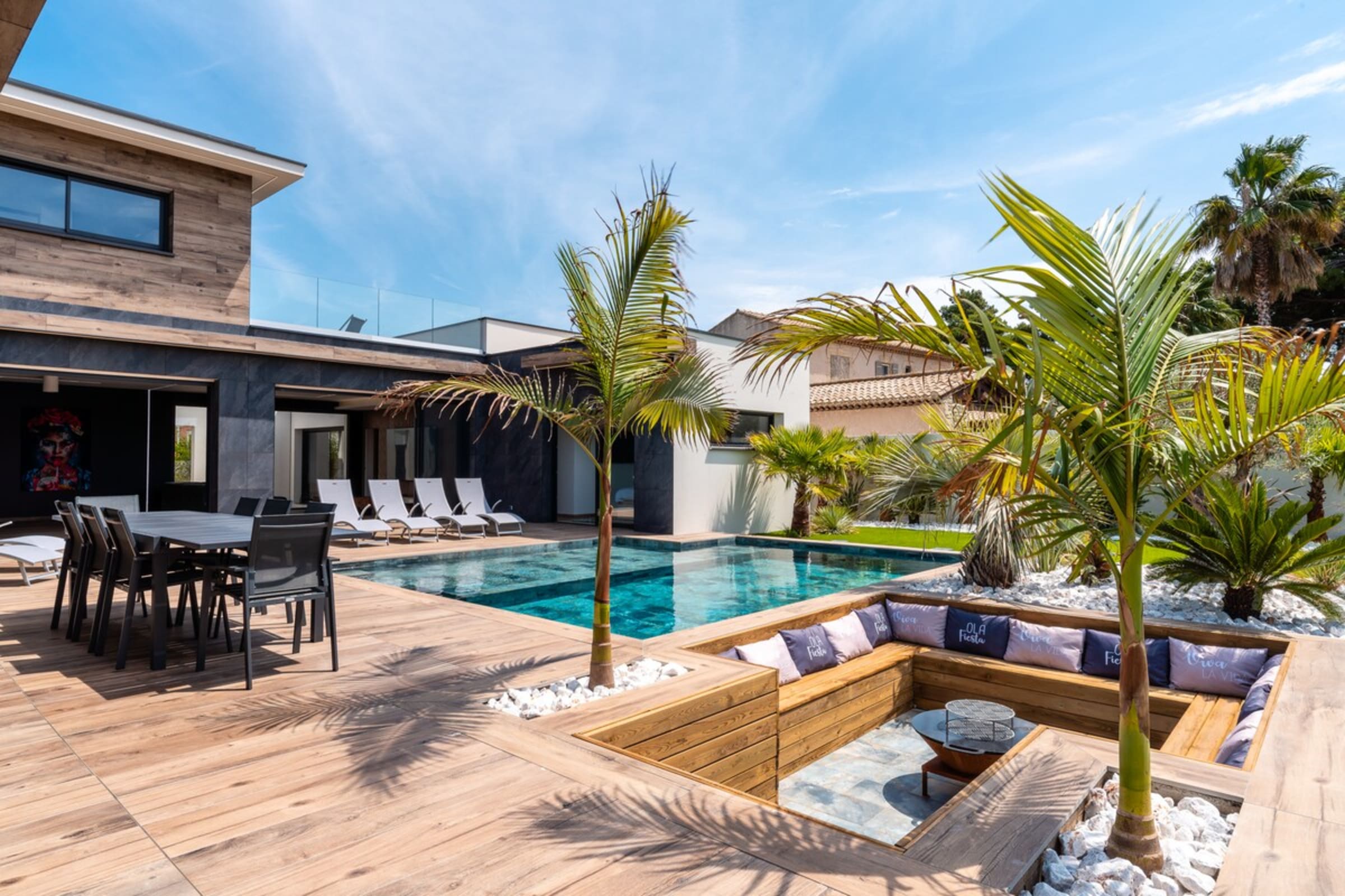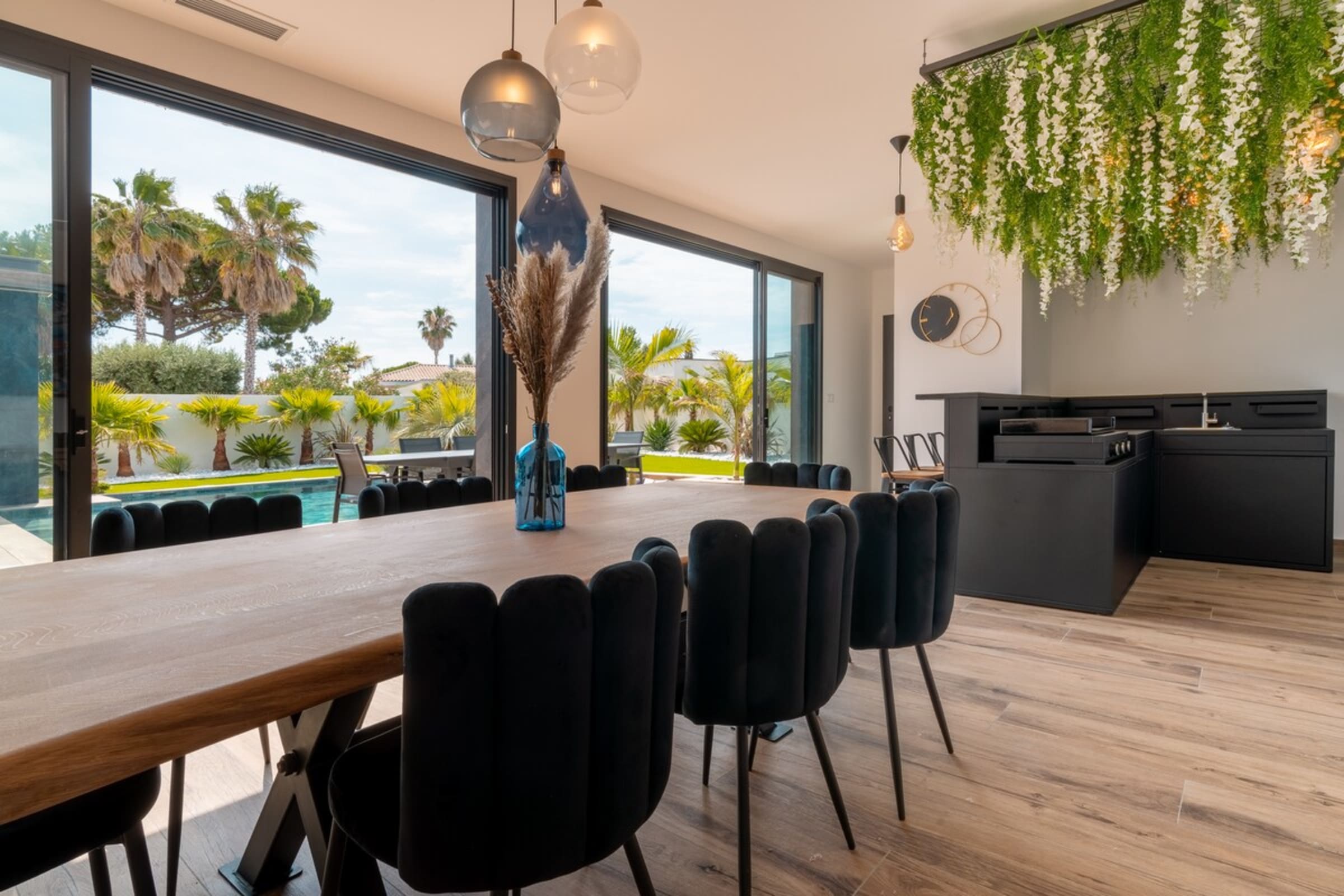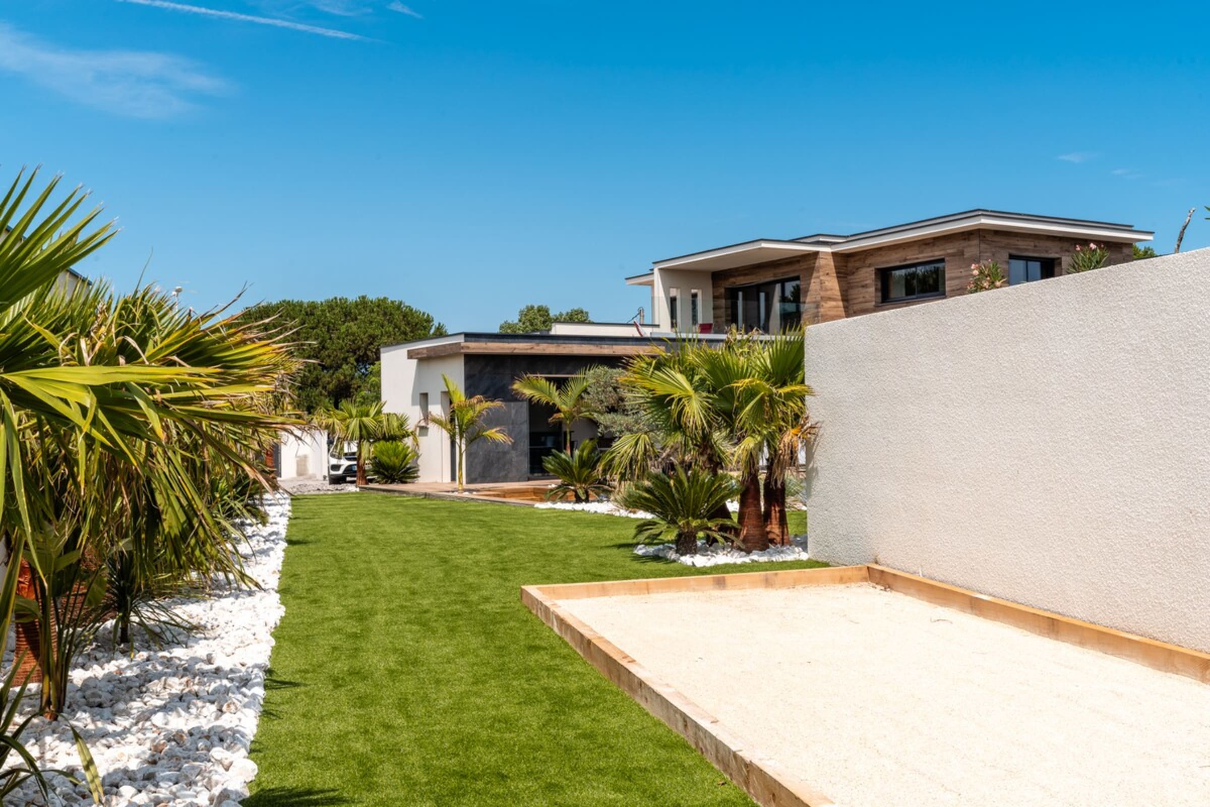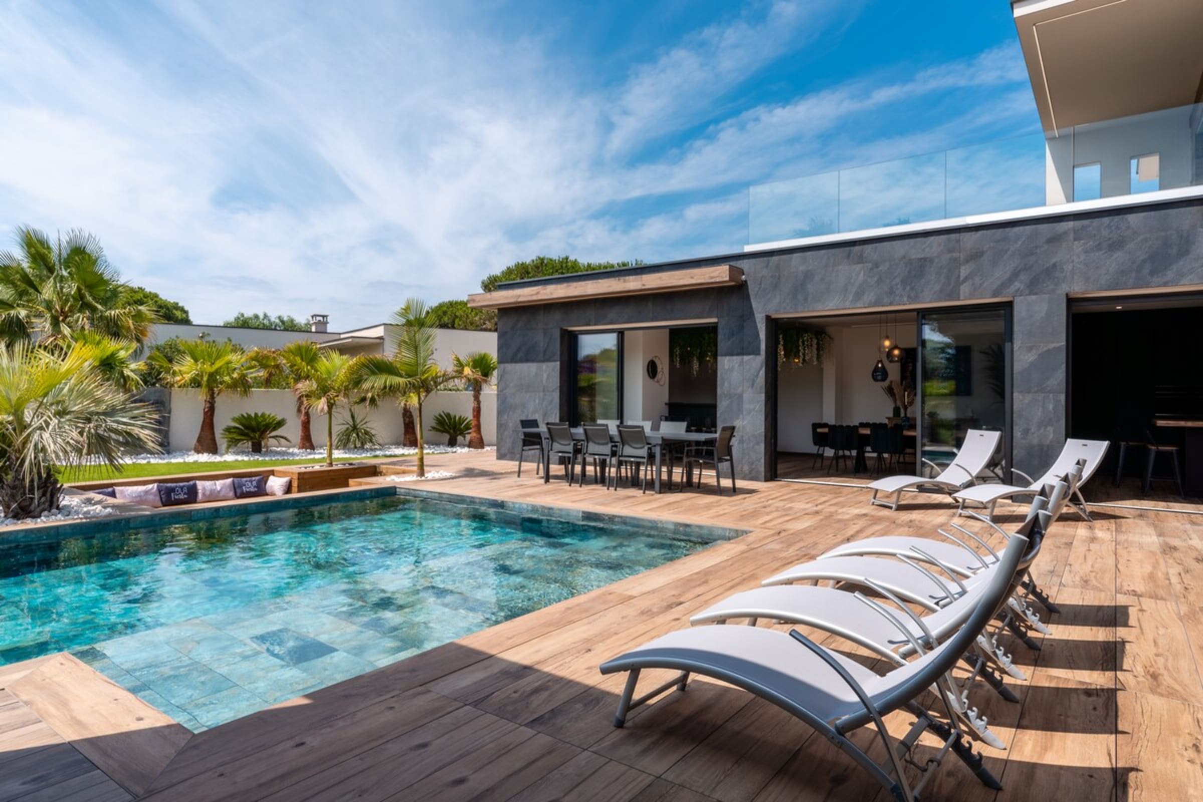 L’immensité des lieux se ressent dès l’entrée : circulation fluide entre intérieur et extérieur, belles pièces à vivre pour que chacun profite de son rythme. Le salon s’ouvre sur la terrasse et la piscine en pierre de Bali ; à proximité, un braséro avec salon lounge abaissé invite aux soirées douces, tandis que le boulodrome promet des parties mémorables. La salle de cinéma prolonge les fins de journée et la cuisine d’été équipée met l’art de vivre en plein air au centre du séjour.