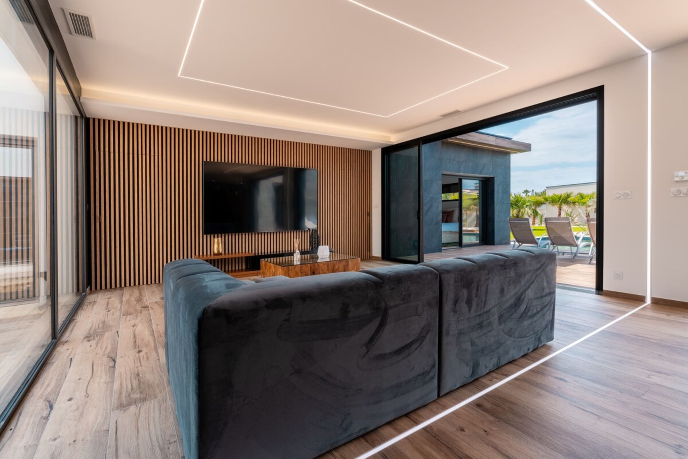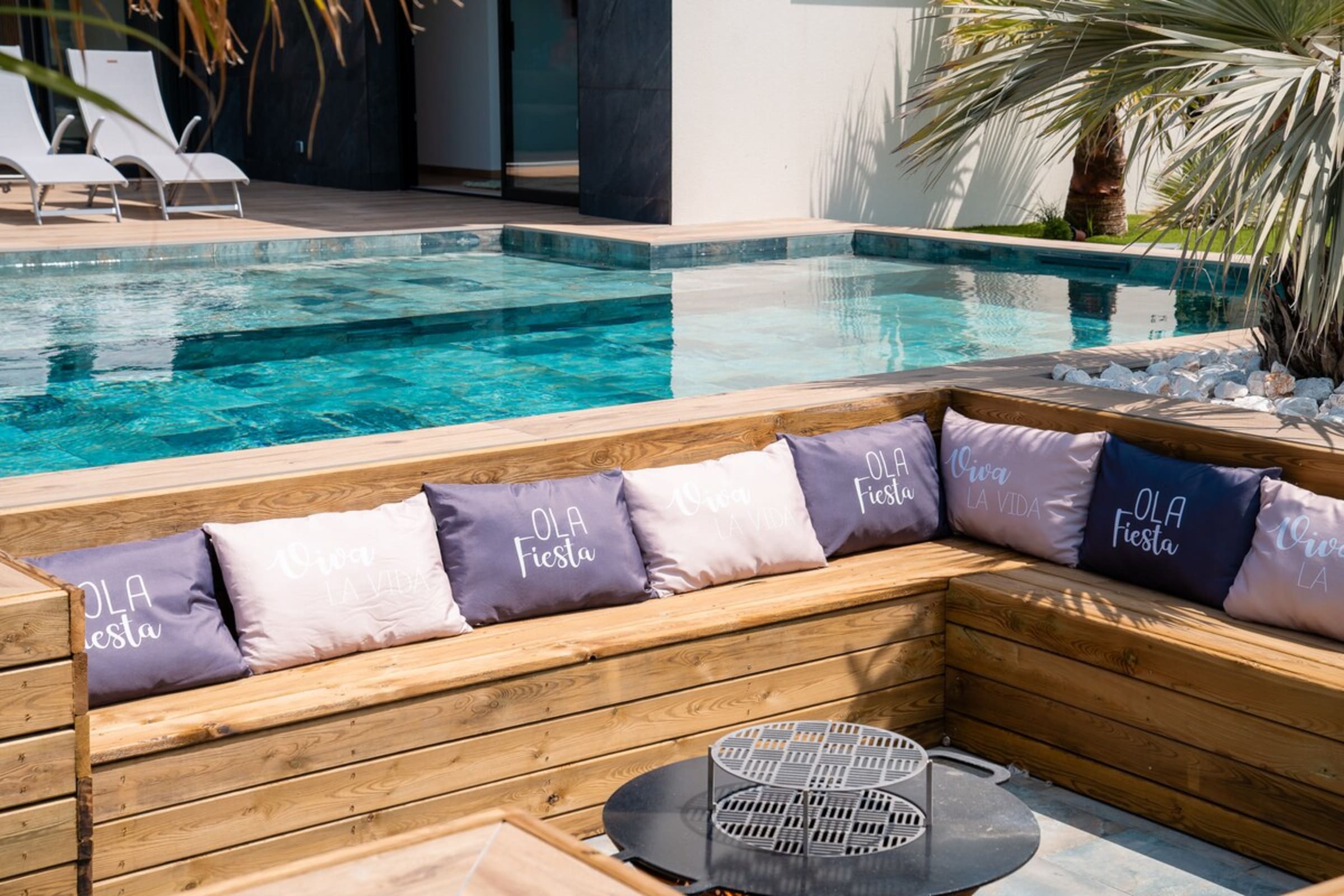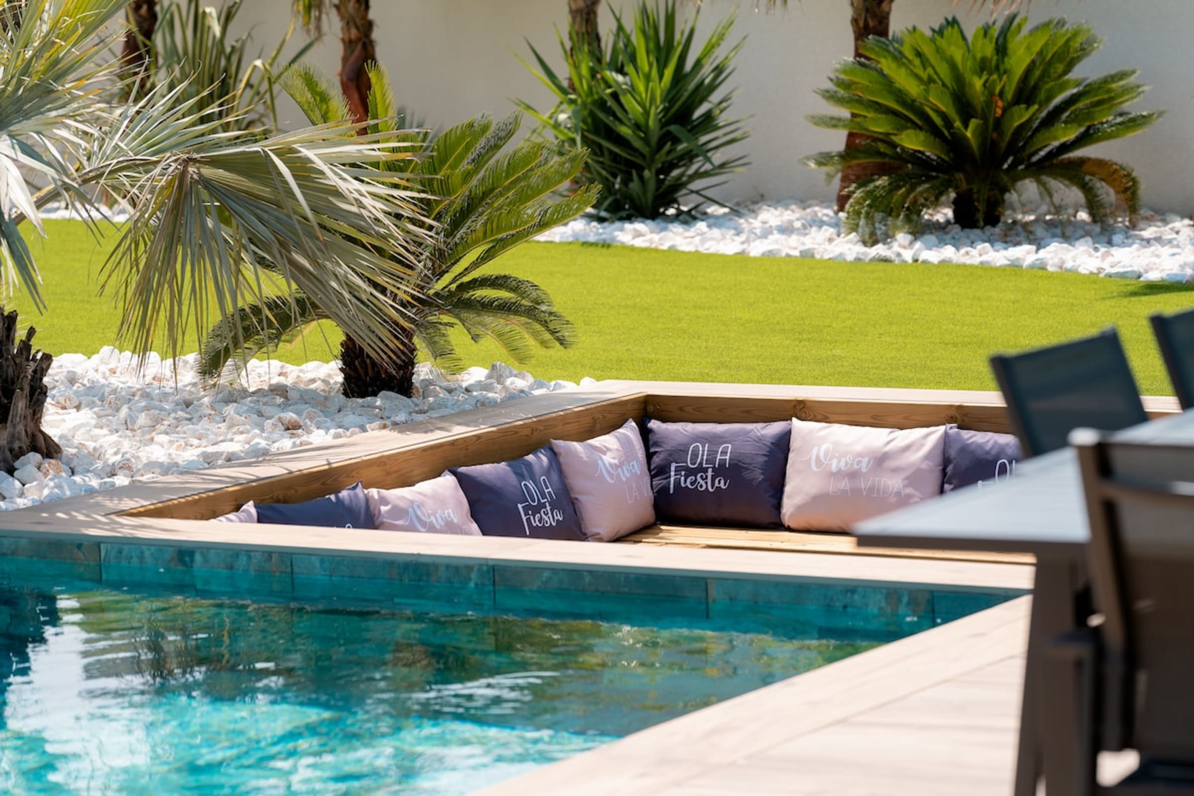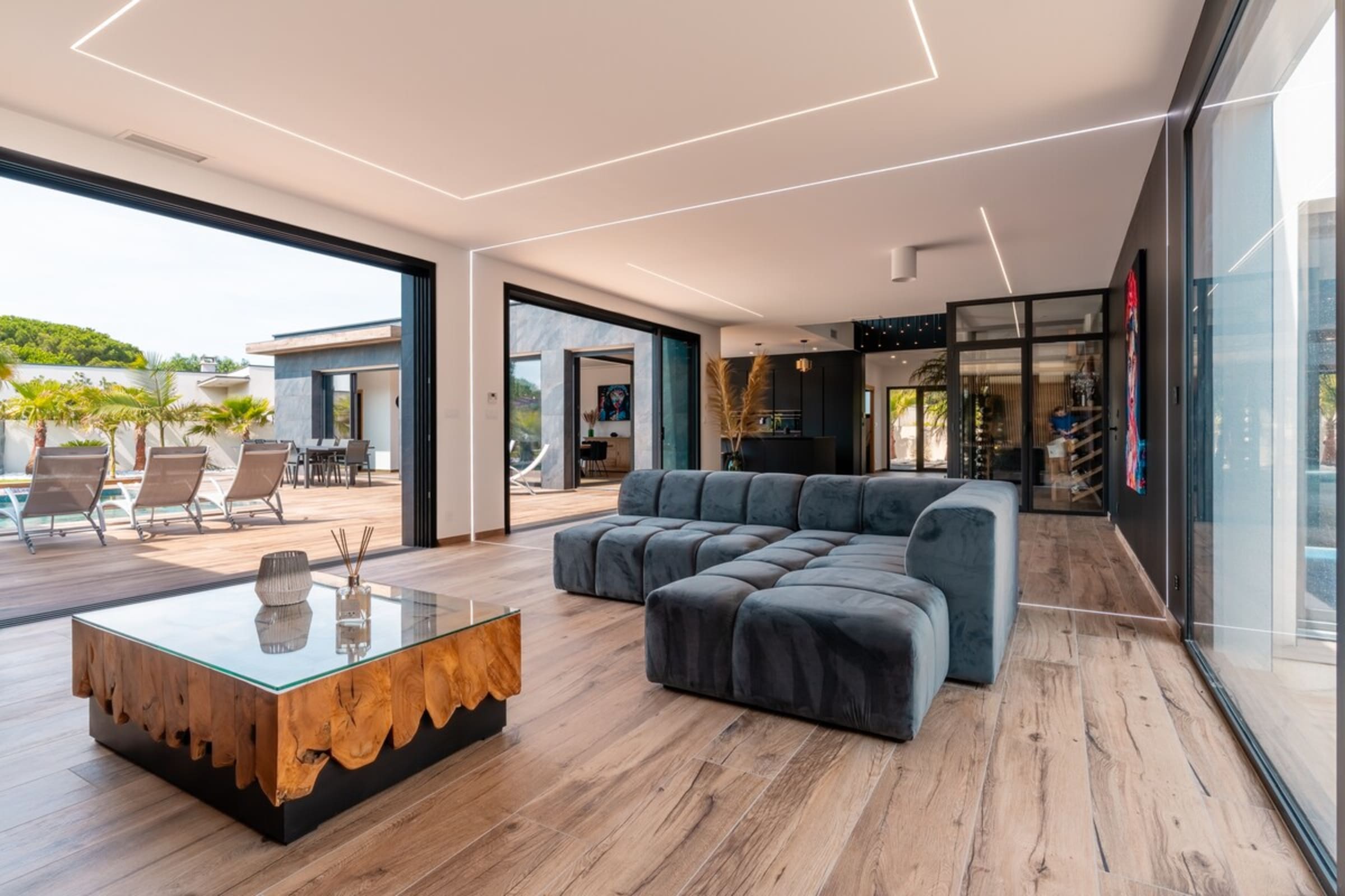 L’immensité des lieux se ressent dès l’entrée : circulation fluide entre intérieur et extérieur, belles pièces à vivre pour que chacun profite de son rythme. Le salon s’ouvre sur la terrasse et la piscine en pierre de Bali ; à proximité, un braséro avec salon lounge abaissé invite aux soirées douces, tandis que le boulodrome promet des parties mémorables. La salle de cinéma prolonge les fins de journée et la cuisine d’été équipée met l’art de vivre en plein air au centre du séjour.