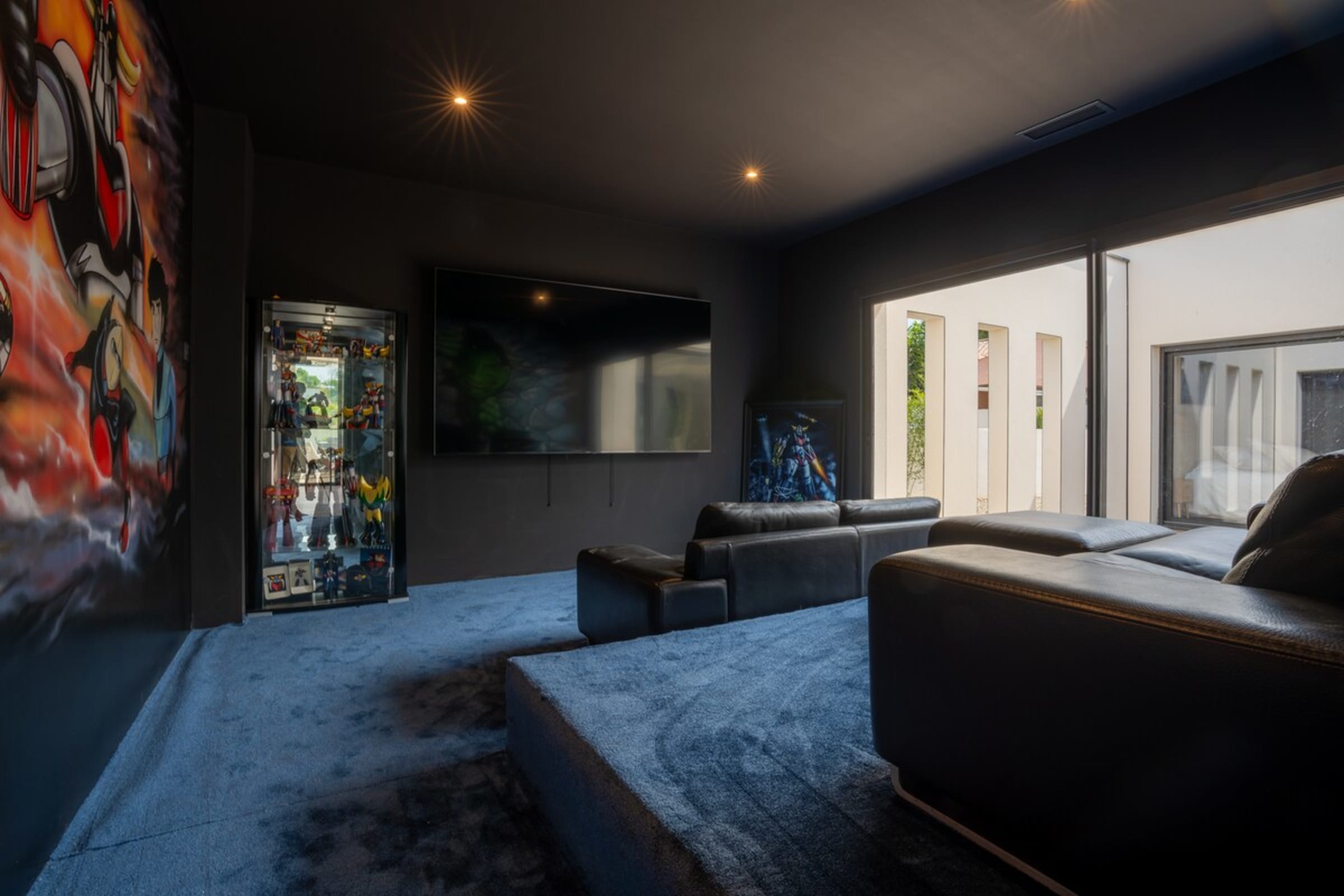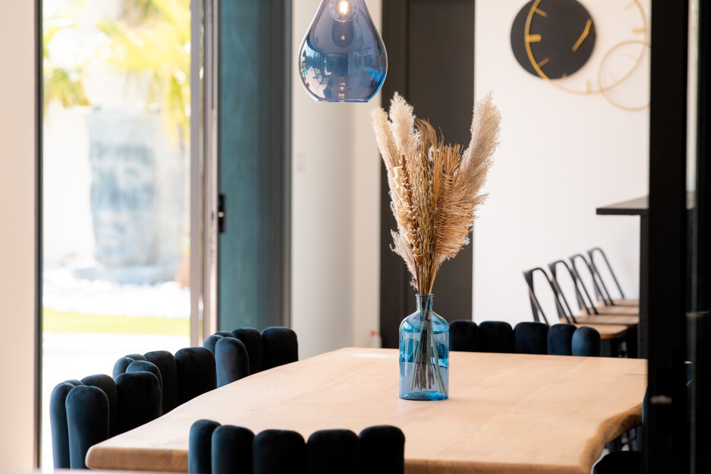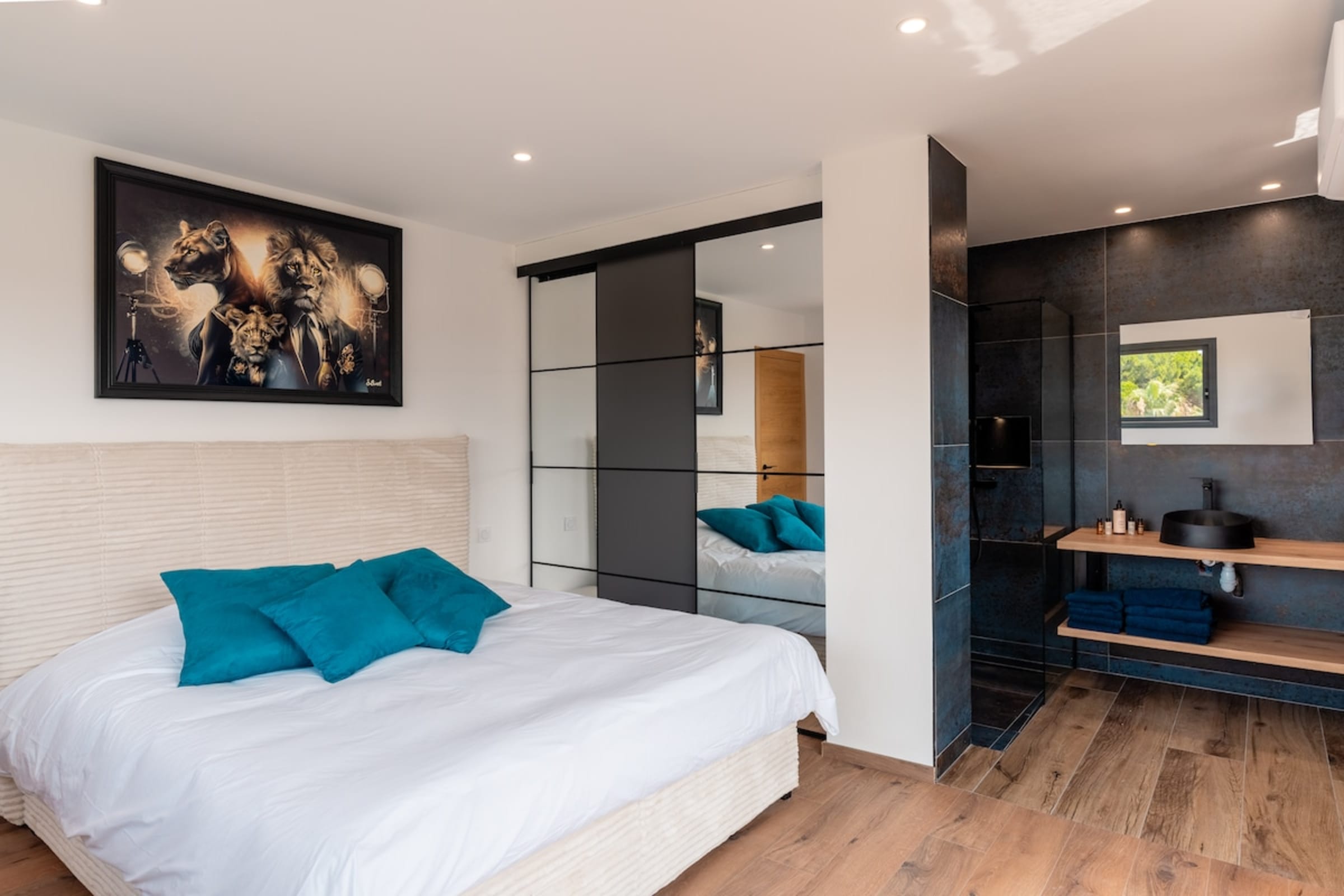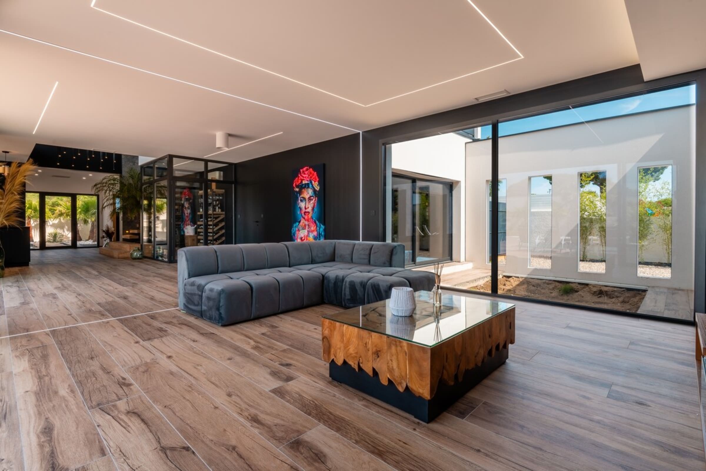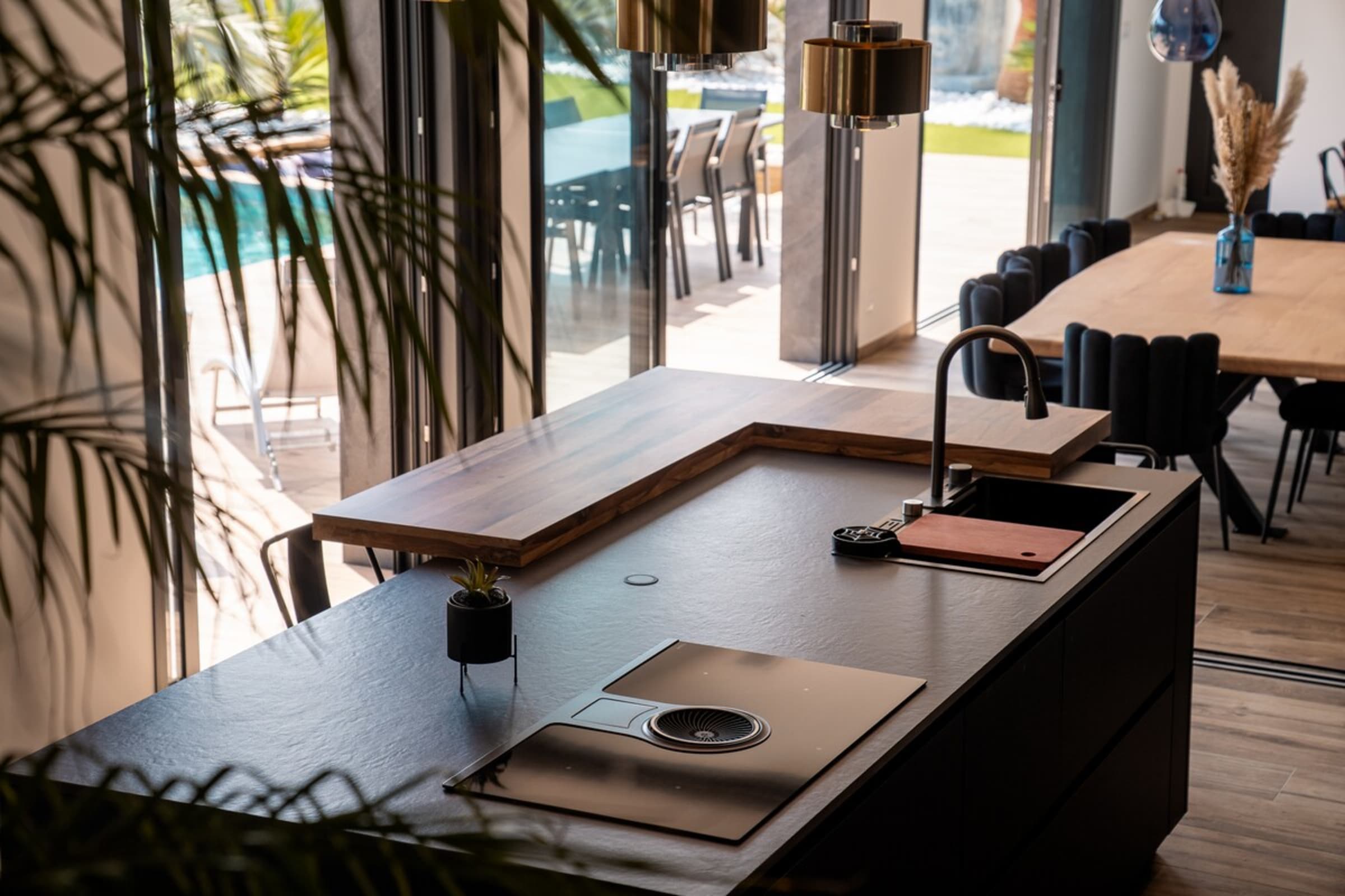 L’immensité des lieux se ressent dès l’entrée : circulation fluide entre intérieur et extérieur, belles pièces à vivre pour que chacun profite de son rythme. Le salon s’ouvre sur la terrasse et la piscine en pierre de Bali ; à proximité, un braséro avec salon lounge abaissé invite aux soirées douces, tandis que le boulodrome promet des parties mémorables. La salle de cinéma prolonge les fins de journée et la cuisine d’été équipée met l’art de vivre en plein air au centre du séjour.